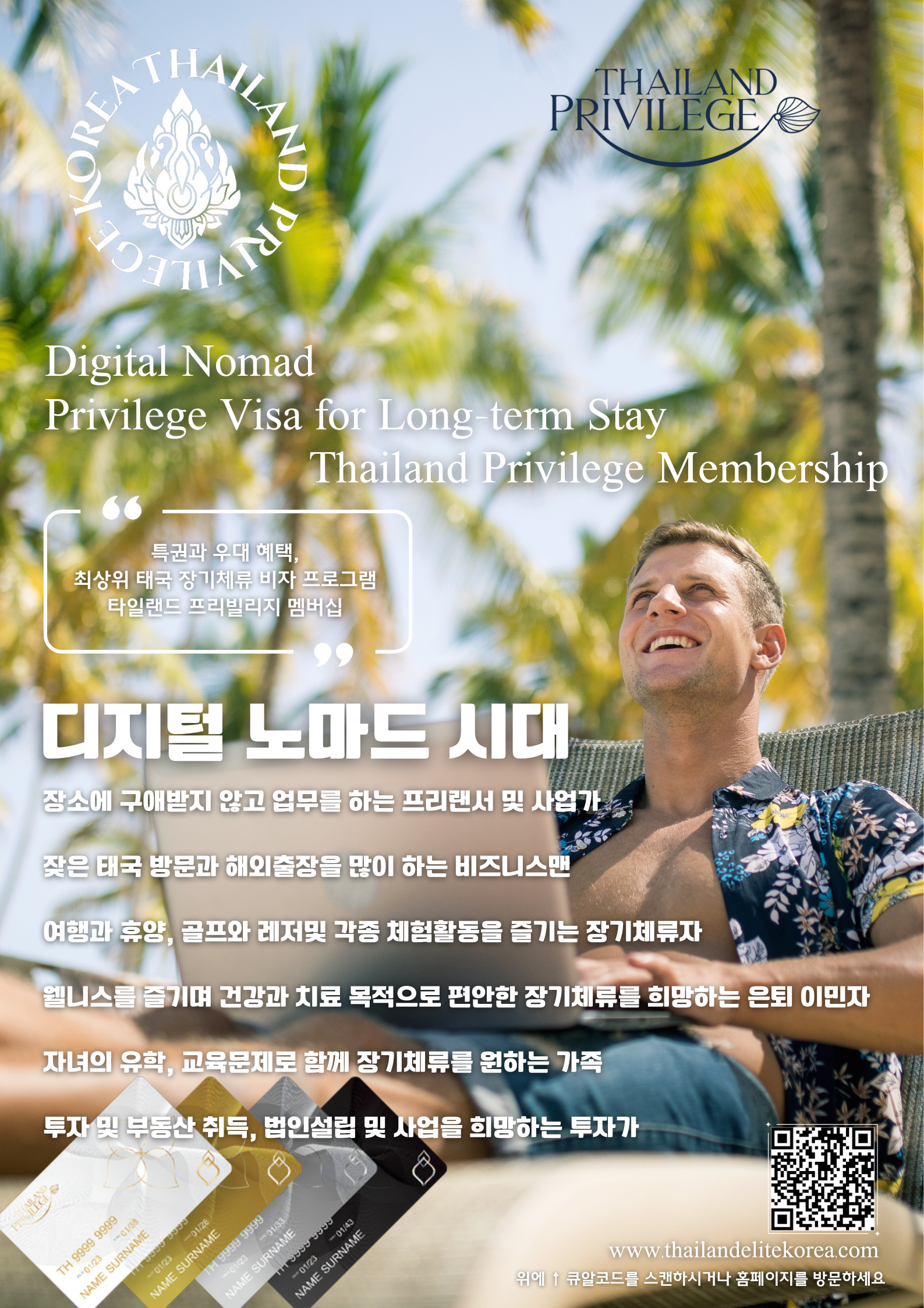 태국 최상위 장기체류 비자 프로그램 ‘타일랜드 프리빌리지 멤버십은, 잦은 해외여행과 출장 사업차 태국을 자주 방문하는 사업가, 투자가, 프리랜서, 퇴직후 은퇴이민자 등, 개인과 가족에게