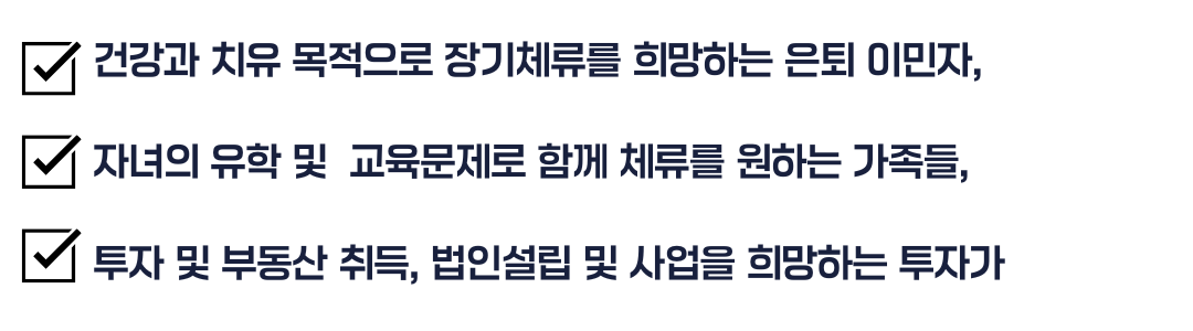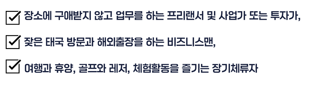 태국 최상위 장기체류 비자 프로그램 ‘타일랜드 프리빌리지 멤버십은, 잦은 해외여행과 출장 사업차 태국을 자주 방문하는 사업가, 투자가, 프리랜서, 퇴직후 은퇴이민자 등, 개인과 가족에게