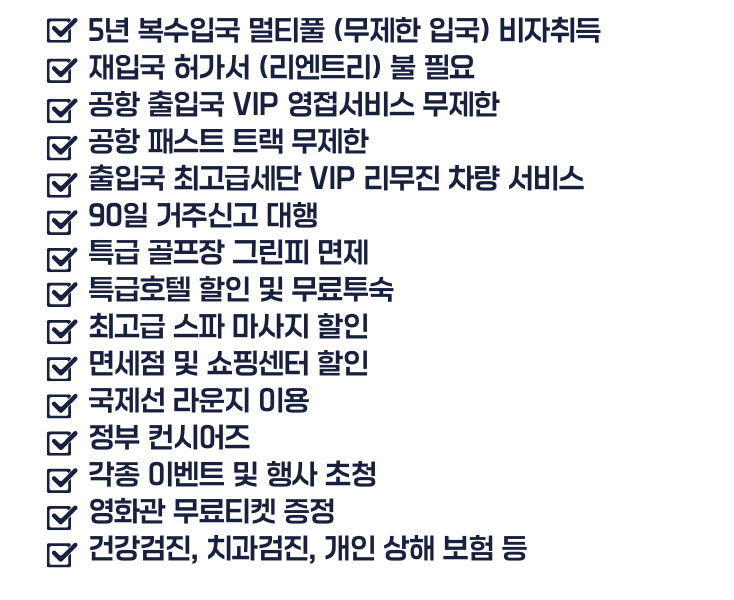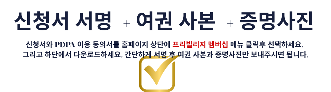 복잡한 서류 준비 없이 신청서와 여권사본, 증명사진으로 가입신청, 간단한 신원조회 심사로 승인이 완료되면 회원가입 후 바로 엘리트 개인비서 (Elite Personal Assistant) 서비스 예약후 신속하고 빠르게 엘리트 비자를 취득할수 있으며 우대 혜택을 즐길 수 있습니다.