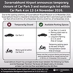 11월 12일부터 14일까지 방콕 쑤완나품 국제공항 (Suvarnabhumi Airport Museum) 개관식 행사로 실내주차장 3번 건물과 야외주차장 4번이 임시로 차단되었습니다. 3, 4번 주차장의 임시차단 여파로 이미 노보텔 호텔 옆 야외 임시 주차공간을 비롯한 1, 2번 주차공간 및 여객 터미널 주변 모든 주차공간이 포화상태가 되었습니다. AOT 공항공사는 모든 주차장 입구에 AOT 직원들을 배치해 버스터미널 맞은편 장기주차 공간(Long Term Parking A, C, D, E)으로 안내를 하고 있으며 이곳에서는 무료 셔틀버스를 이용해 여객 터미널까지 이동해야 하는 불편함이 있으니 참고하시길 바랍니다.
